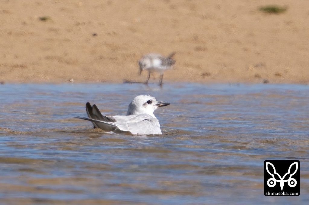 ハシブトアジサシを見つけました。今季初めての飛来となります。車を走らせていると一瞬、アジサシとすれ違い、顔がどう見てもハシブトアジサシに見えたので戻って探すと海岸に降りて水浴びをしていました。