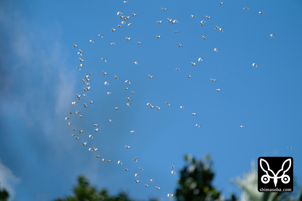アマサギとコサギの群れ。大小さまざまな群れがやってきて渡りの勇壮さを感じさせてくれました。