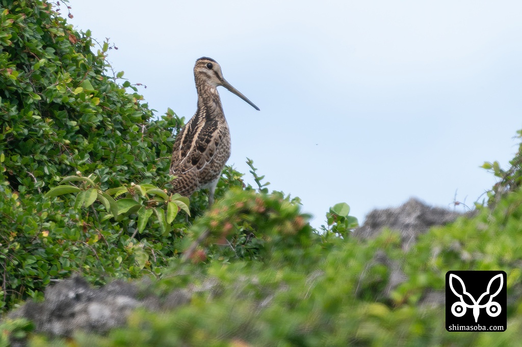 東崎では、まさに到着したばかりというチュウジシギが岬の先端にいました。