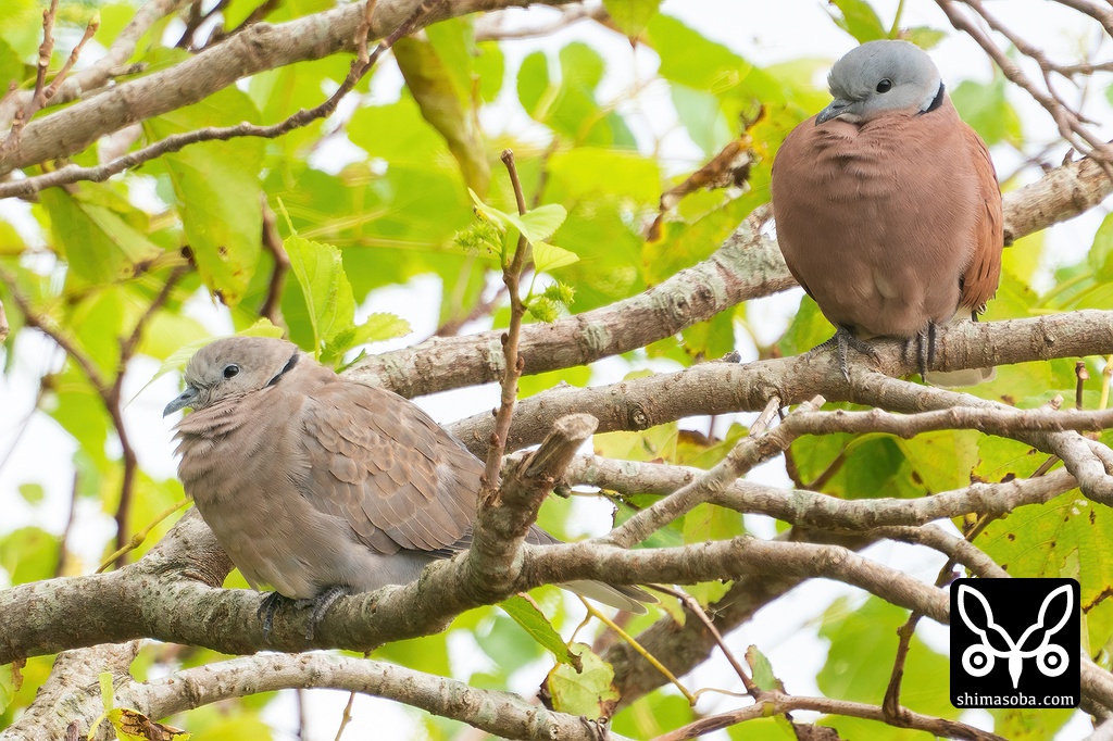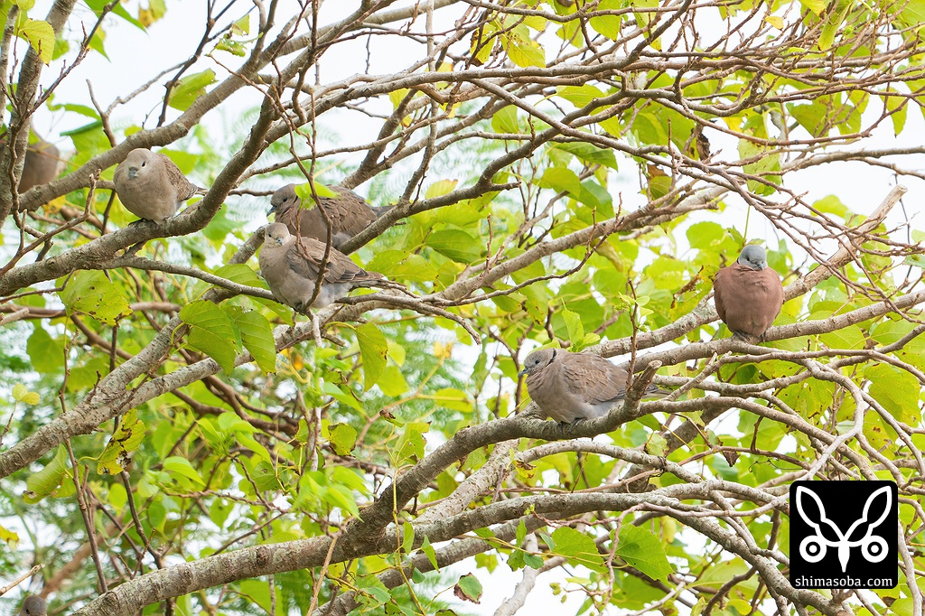 仕事の移動中にキジバトの群れを発見。八重山には「キジバトの中にベニバトあり」という格言があるので少し寄り道をして探してみるとオス1羽とメス4羽、幼鳥1羽の合わせて6羽のベニバトが交じっていました。4羽までは見るのですが、6羽を一度に見ることはそうそうありません。