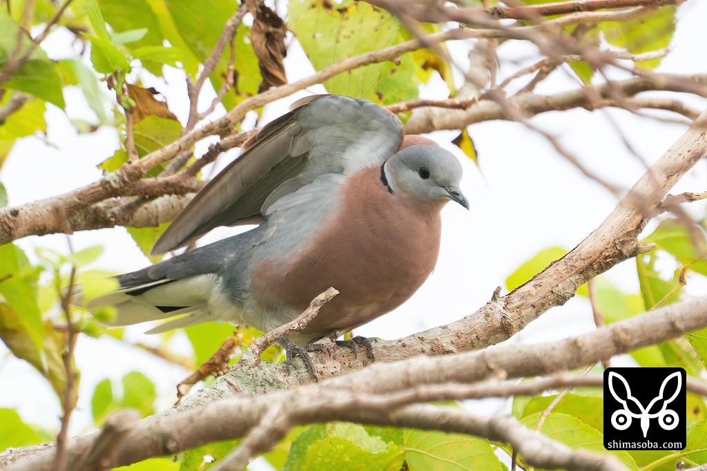 伸びをするベニバトのオス。尾羽の先端半分の白い部分は飛ぶと時によく目立ちます。