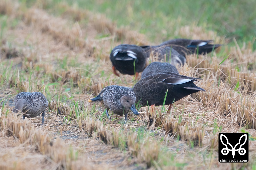 稲刈りが終わった田んぼではオナガガモの幼鳥たちがカルガモと採餌していました。カルガモについて回っていました。安心するのでしょうか。