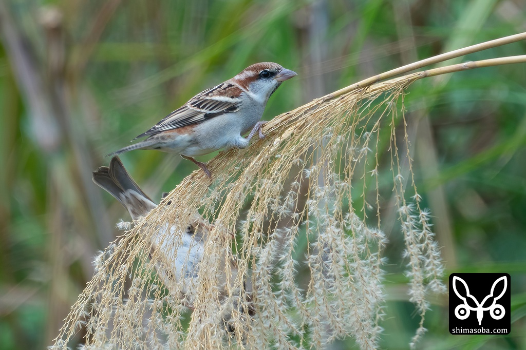 ススキにぶら下がっているスズメと比べるとニュウナイスズメの小ささが分かります。