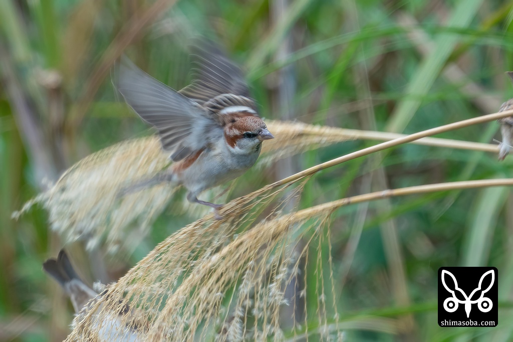 ニュウナイスズメ飛翔ですが、シャッタースピードが遅すぎて羽の様子が全く分かりません。^^;