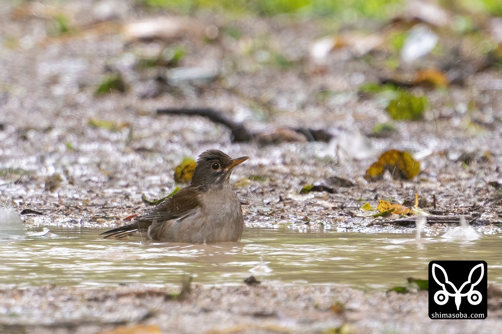アカハラの群れが雨の中、水浴びしていました。近くではシロハラも水浴び。アカハラの水浴びを見ているとウグイスも出てきました。