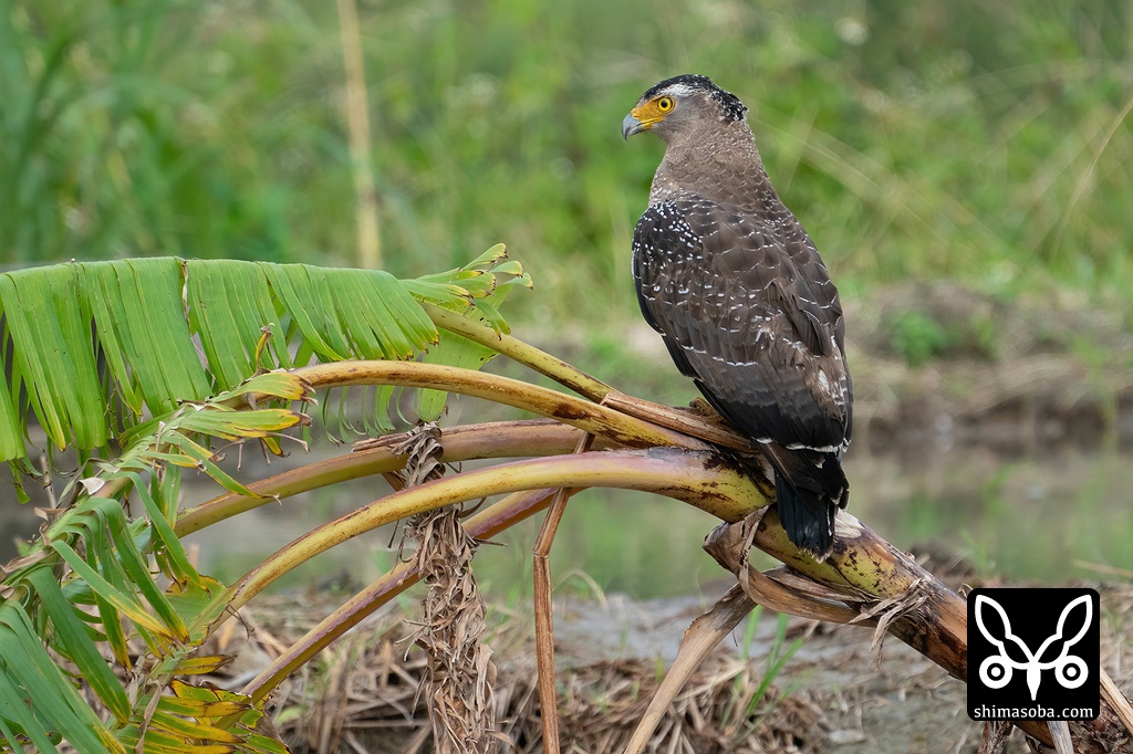 バナナの木に止まりながらマングローブ湿地のカニを狙うカンムリワシ。石垣島らしい風景です。