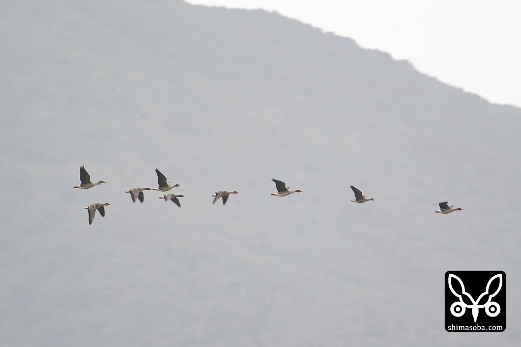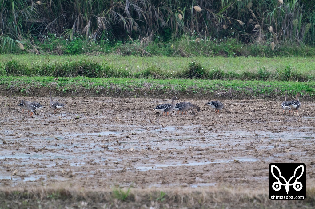 ヒシクイ、オオヒシクイ、マガンの群れは9羽まで増えました。最初は 10月にマガン1羽 、 11月にヒシクイ4羽 、いつの間にかオオヒシクイが3羽合流してしばらく8羽でいたのですが、つい数日前にさらにヒシクイが1羽追加され、現在は9羽の群れで越冬中。石垣島でこの数は初記録と思われます。西表島では過去にコハクチョウ9羽の記録があります。
