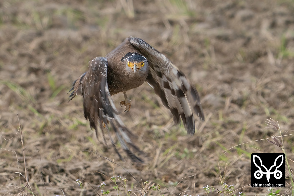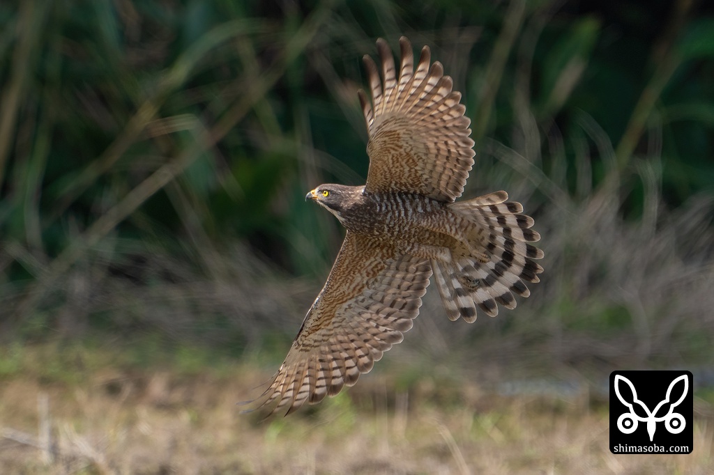 農耕地を飛ぶサシバの成鳥メス。