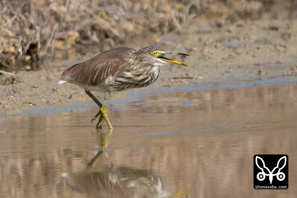 ヤゴを捕まえたアカガシラサギ。