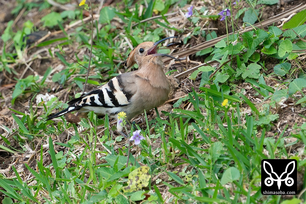 紫色のリュウキュウコスミレや黄色の花に囲まれて春らしいヤツガシラでした。