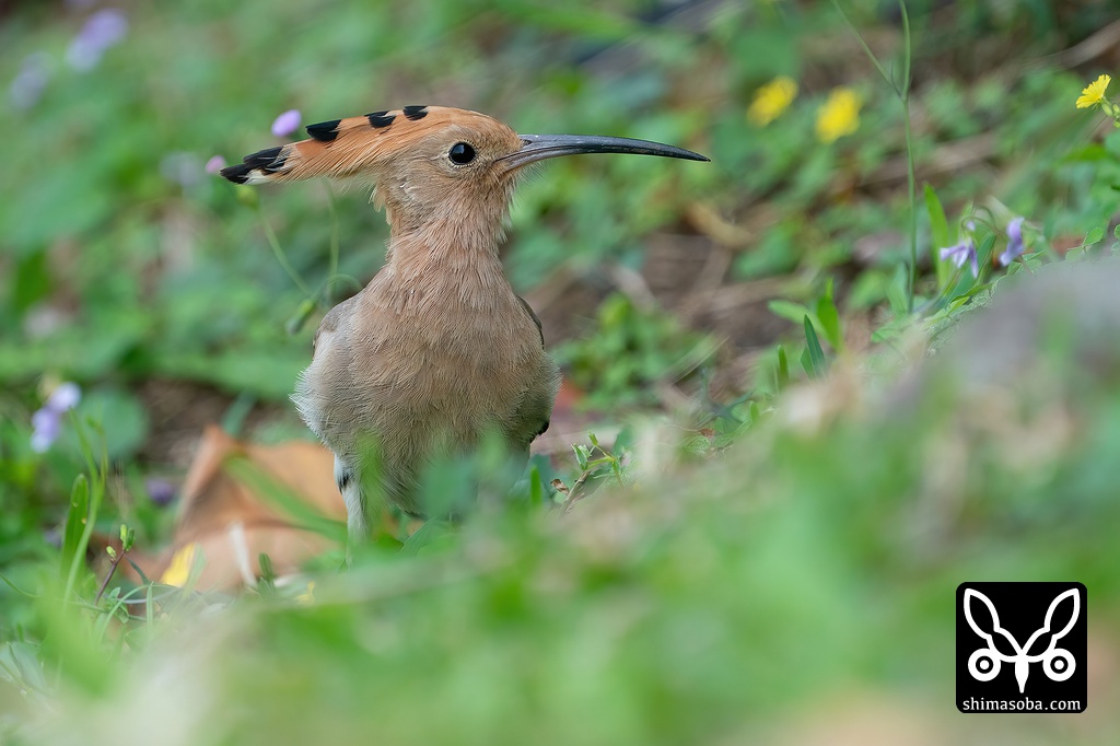 小さな花が咲く芝生を歩き回りながら餌を探すヤツガシラ。