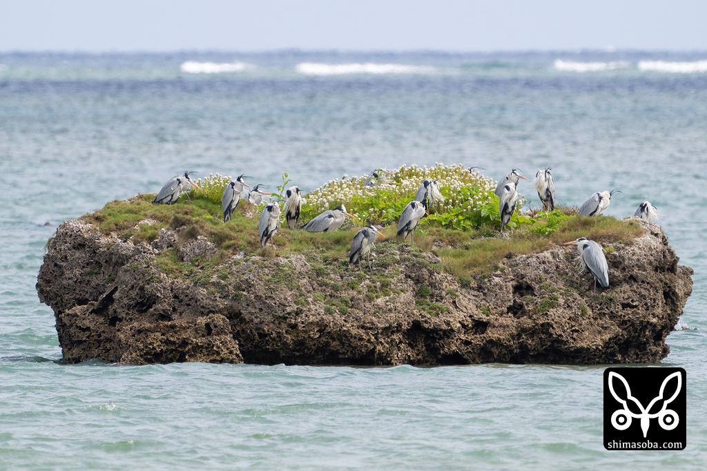 春の渡り組としては今季初のホウロクシギ1羽とシマアジ5羽とアカガシラサギ2羽が現れました。アオサギは中継組の群れが沖合の岩礁で休憩していました。