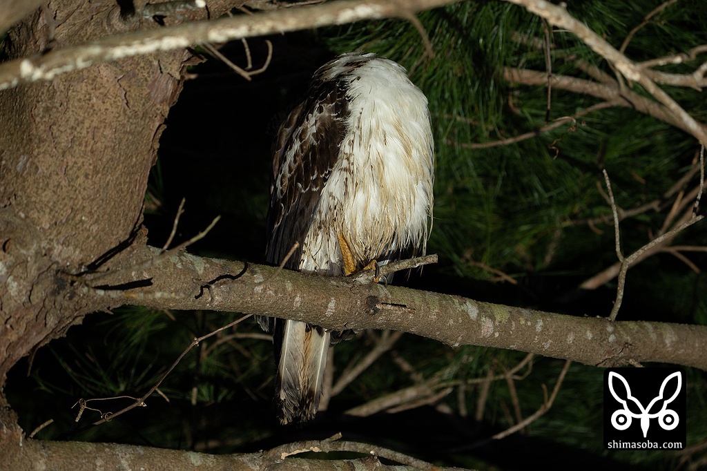 カンムリワシ幼鳥は成鳥に追われながら島内の農地を転々としています。夜、コノハズクの営巣地を回っていたらリュウキュウマツで寝るカンムリワシの幼鳥に出会いました。