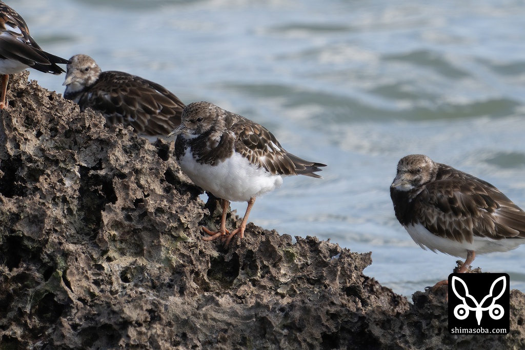 満潮時間帯、岩の上で休憩するキョウジョシギの群れ。