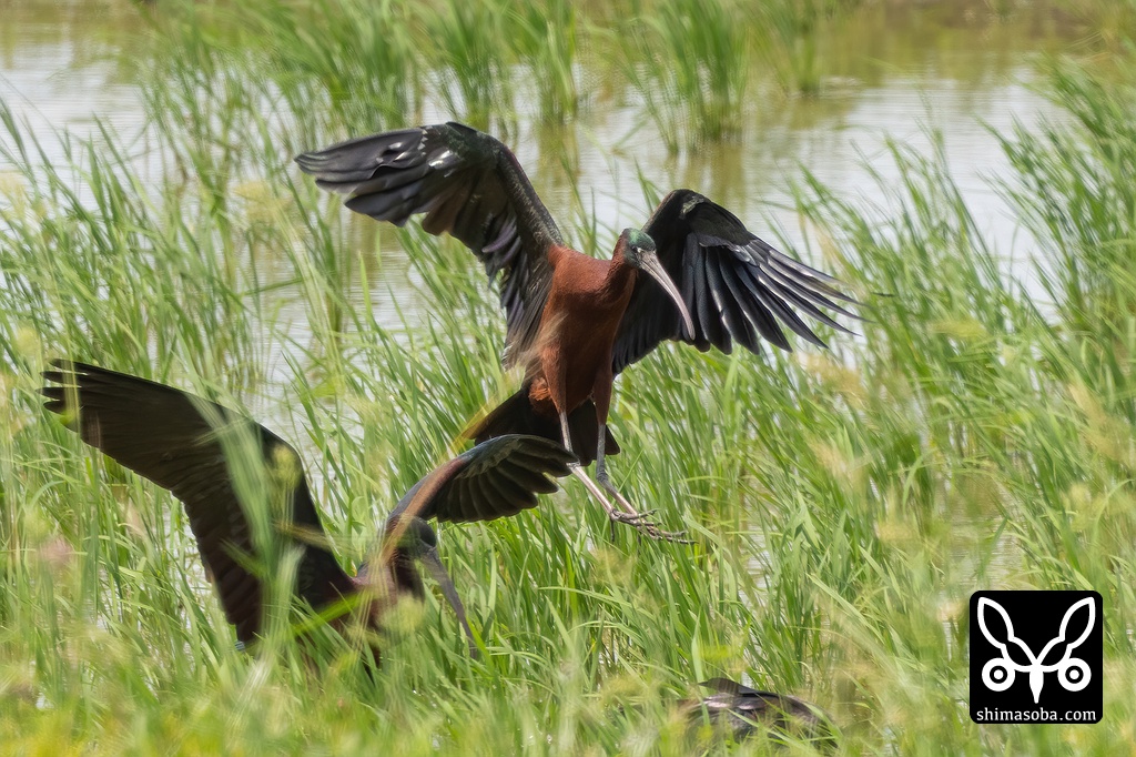 - ブロンズトキ、レンカク、クロハラアジサシが同じ田んぼに滞在中(2019年6月30日)