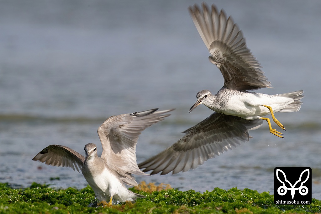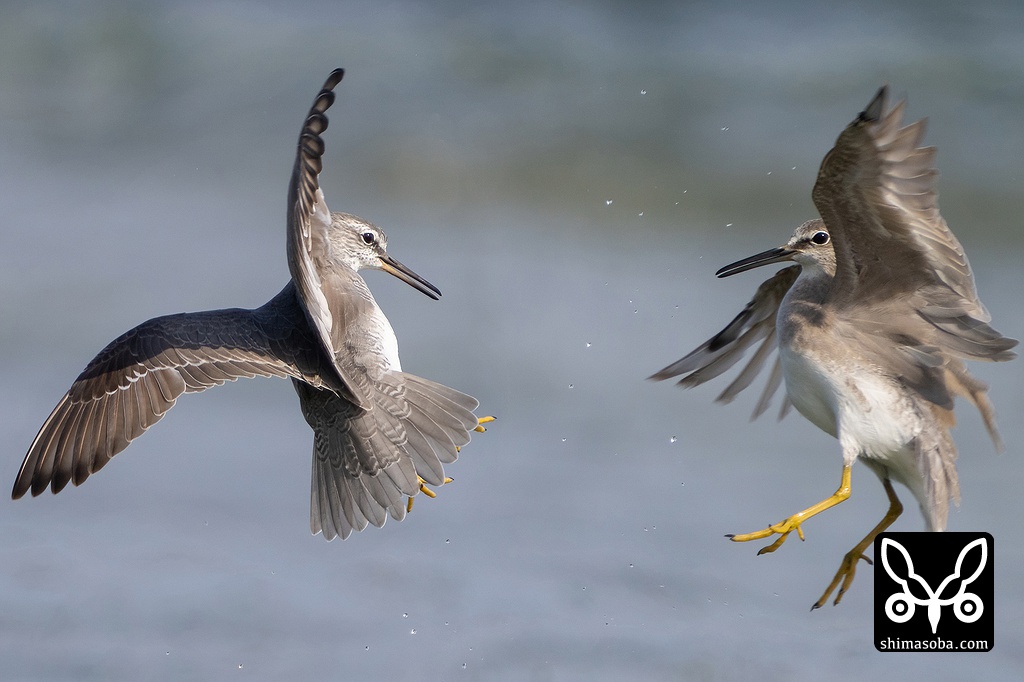 キアシシギの空中戦。左が成鳥で右は幼鳥です。
