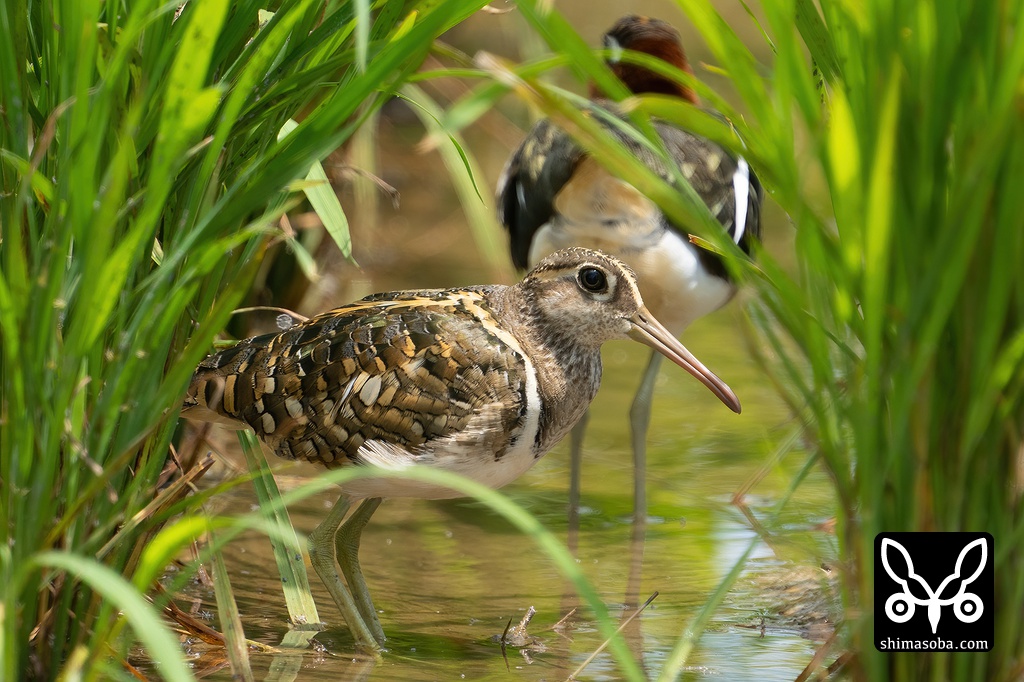 タマシギのオス。後ろにいるのはメス。