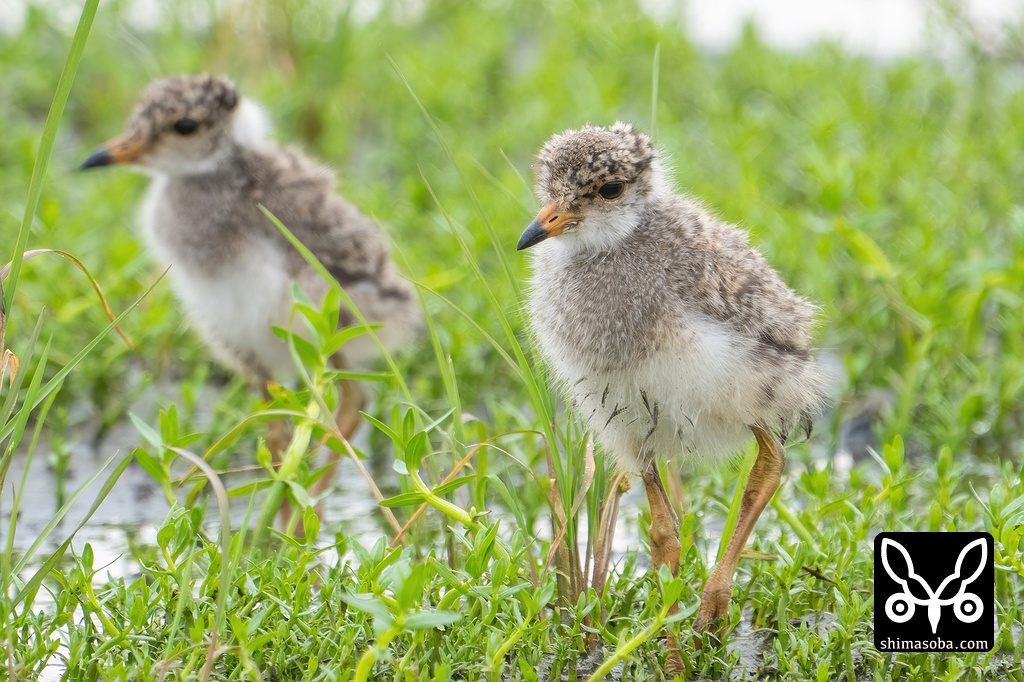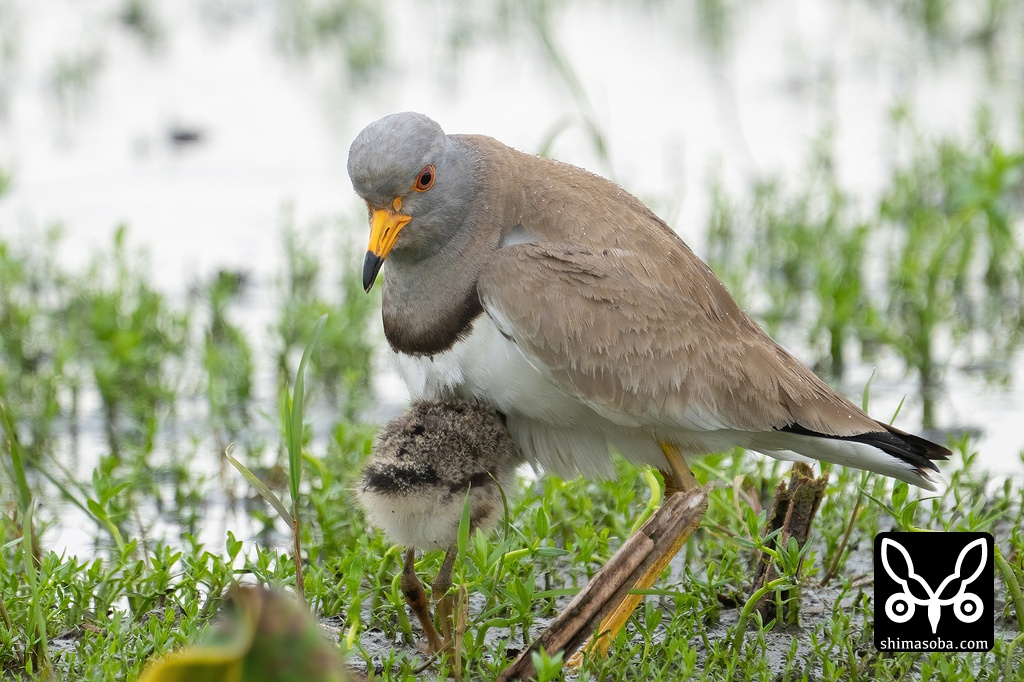カラスに驚いて親鳥の腹の下に逃げ込むケリのヒナ。