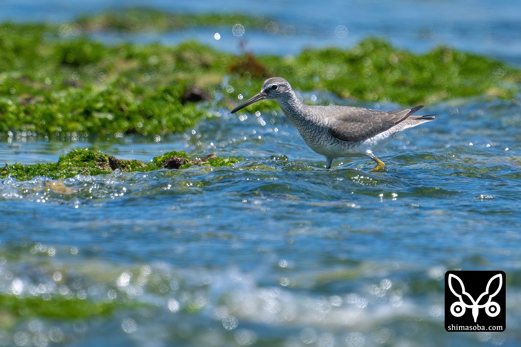 波打ち際を走り回り獲物を探すキアシシギ成鳥。