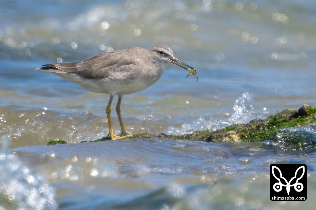 潮溜りでカニを捕まえたキアシシギ成鳥。