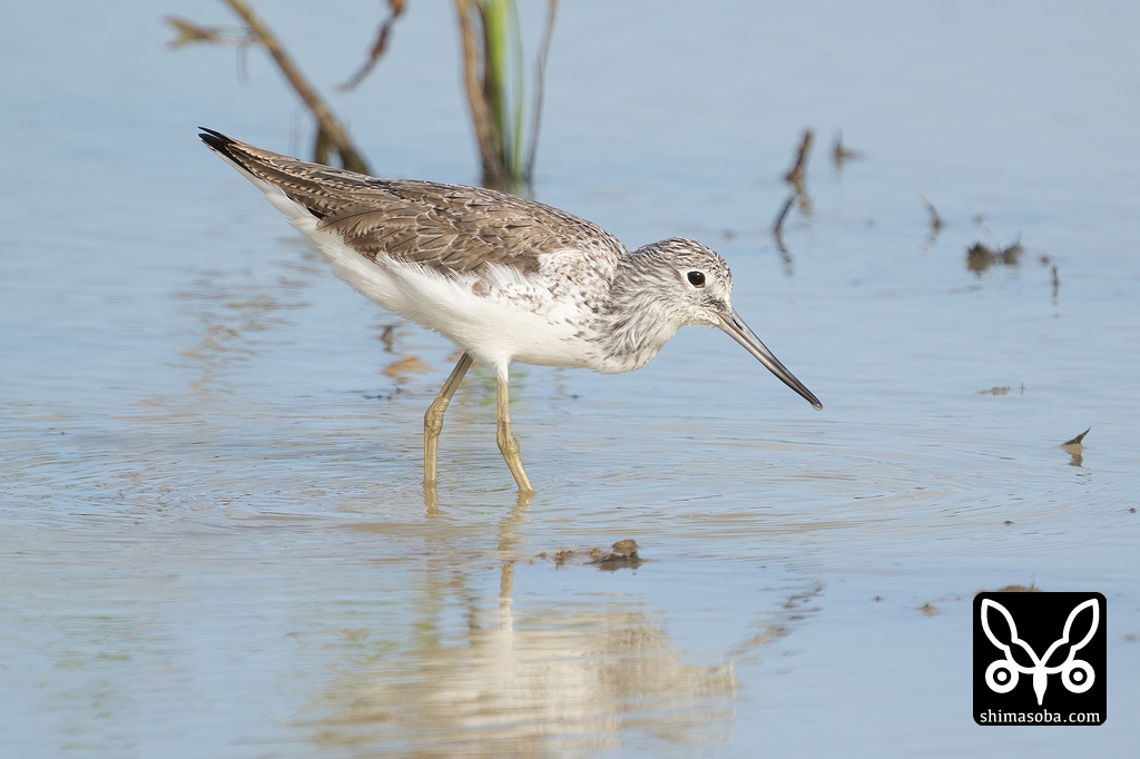 アオアシシギ。古い幼羽が残っているので第1回夏羽へ換羽中。