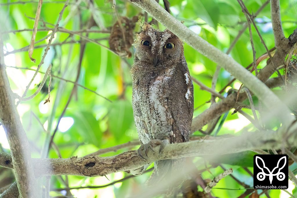 リュウキュウコノハズクのオス。ツル性の植物が絡み合ったところに巧妙に隠れていました。現在、営巣中と思われる場所を含めて5カ所でリュウキュウコノハズクを観察中。