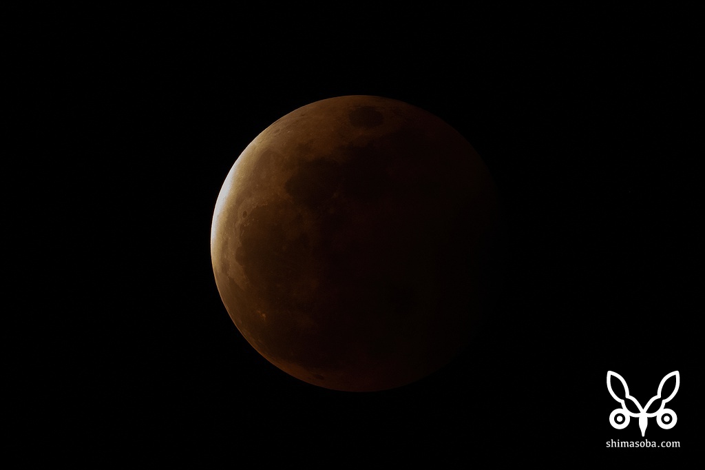 怪しい赤銅色に輝く皆既蝕を迎えたスーパームーン。
