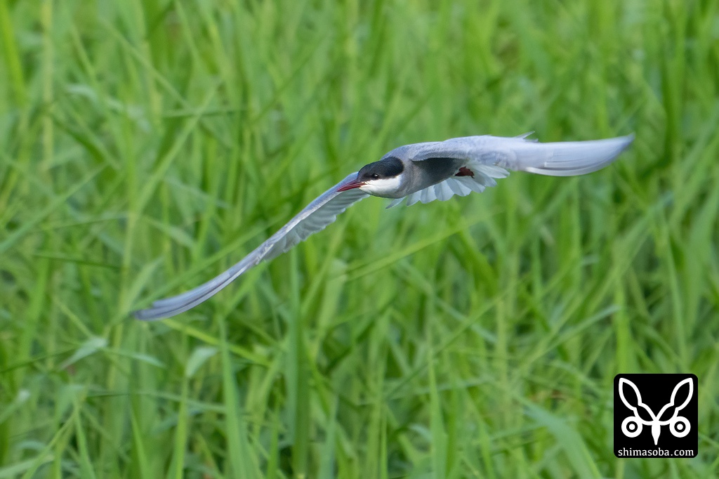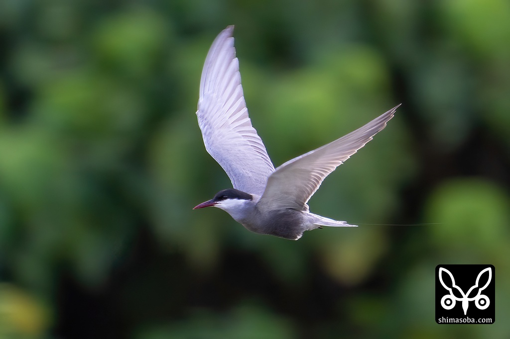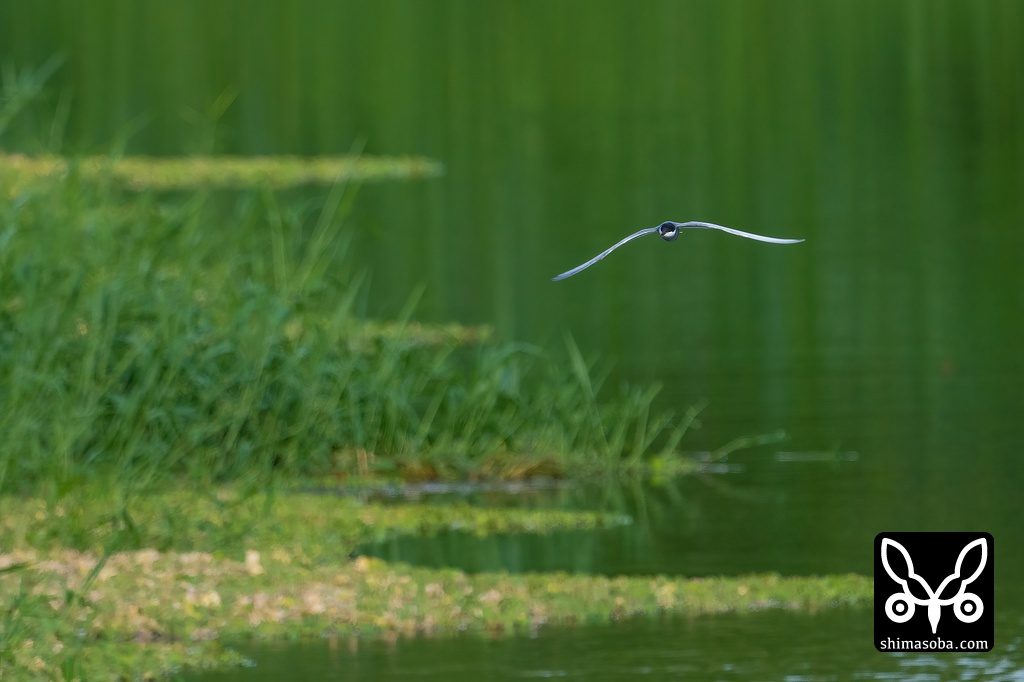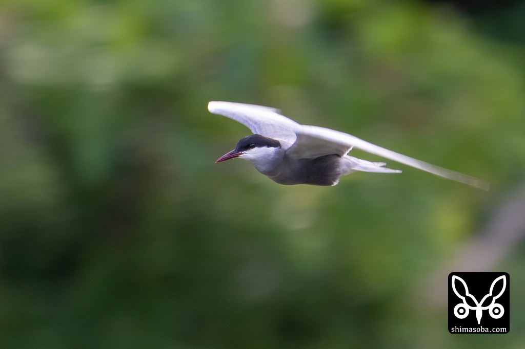 河岸を飛び回りながら獲物を探すクロハラアジサシ。
