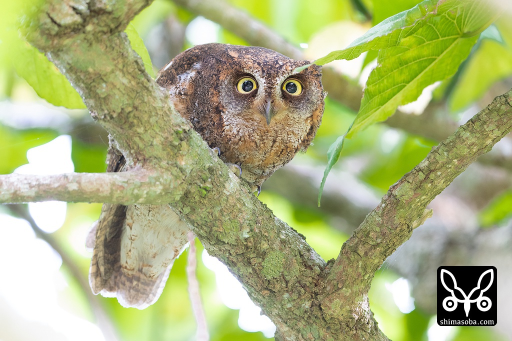 リュウキュウコノハズクのオス。カラスを警戒しています。