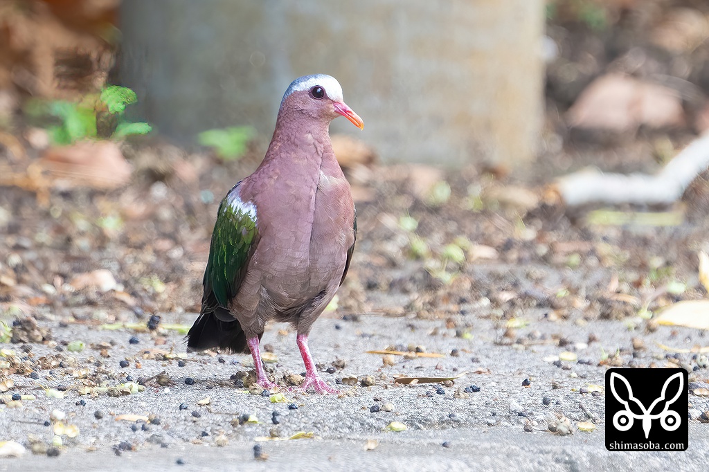 帰り道には歩道でキンバトのオスを発見。この時季見るキンバトはたいていオオバギの種子を食っています。