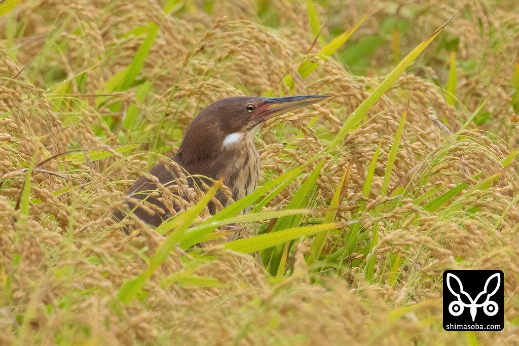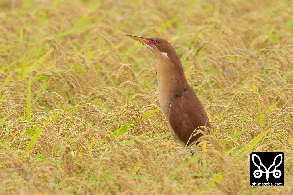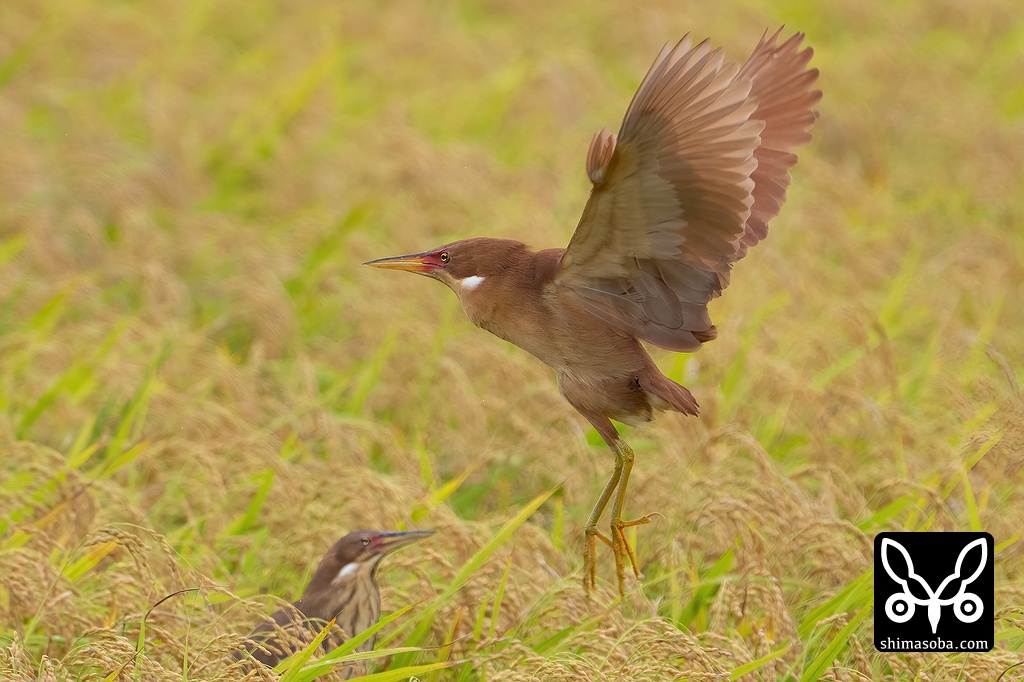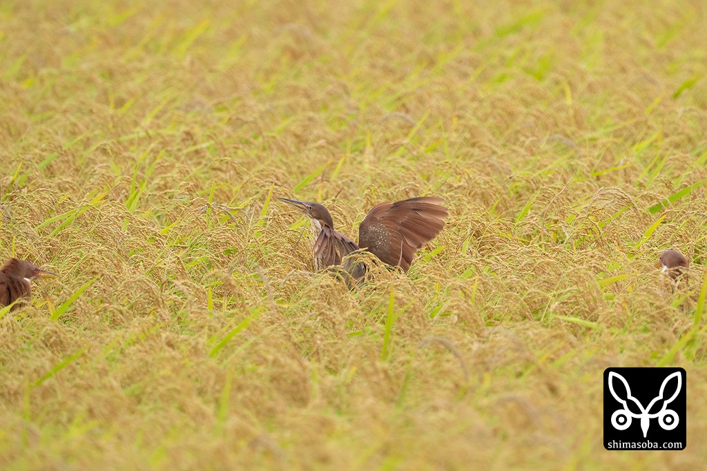 きれいな婚姻色に染まったオレンジ色のリュウキュウヨシゴイたちがまもなく刈り取りが始まる黄金色の稲穂の上を飛び回っていました。