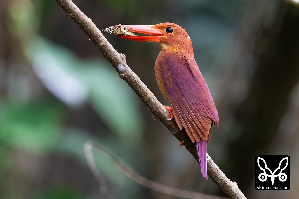 大きめのバッタを巣のヒナへ運んできたアカショウビン。巣立ちまでは、あと10日ほどでしょうか。