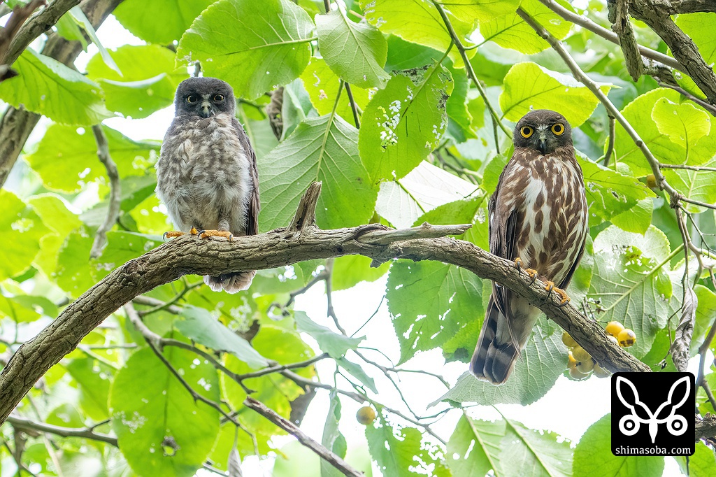 アオバズクはすでに3カ所で巣立ち。ヒナの数は1〜2羽の若干少なめです。こちらは1羽だけの巣立ちでした。左がヒナで右がメス。