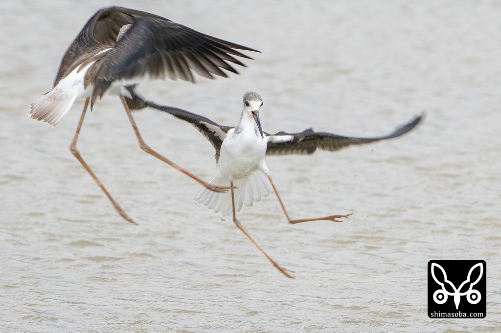 セイタカシギの争い。両者ともに幼鳥。