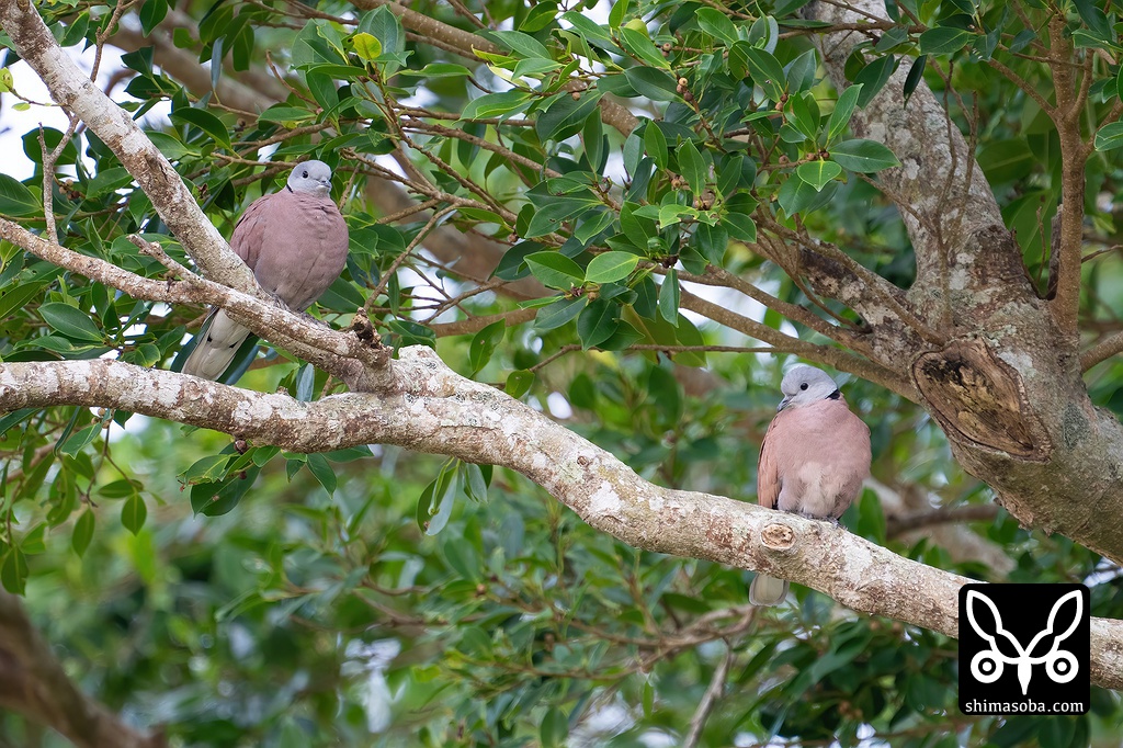 ベニバトのオス。左が第1回冬羽で右は成鳥。