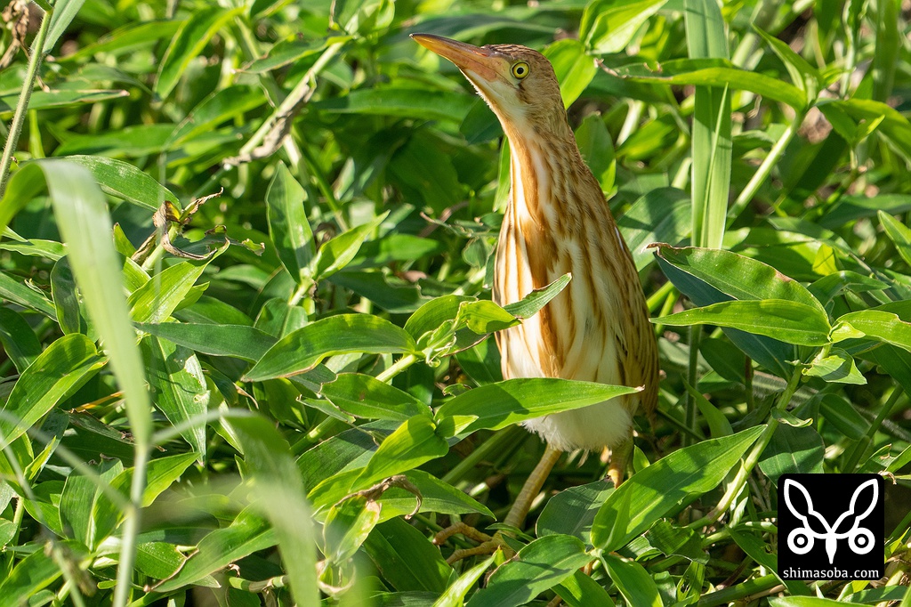 目が合って緊張するヨシゴイの幼鳥。