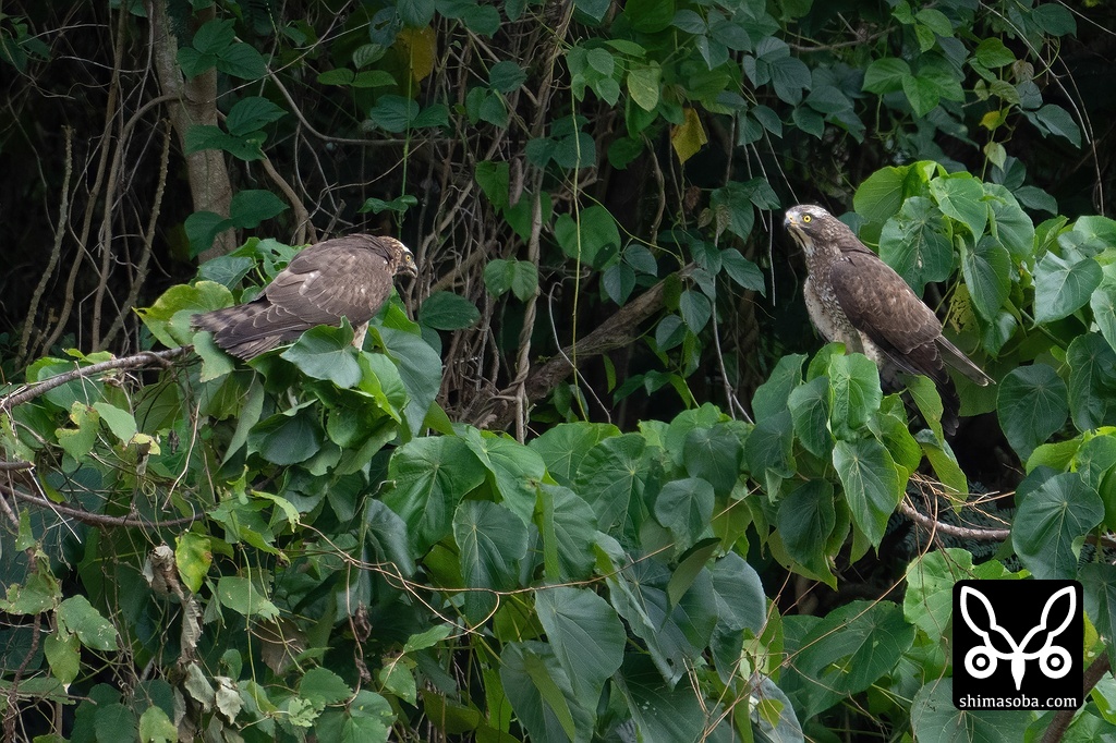 にらみ合うサシバの幼鳥(左)と成鳥メス。