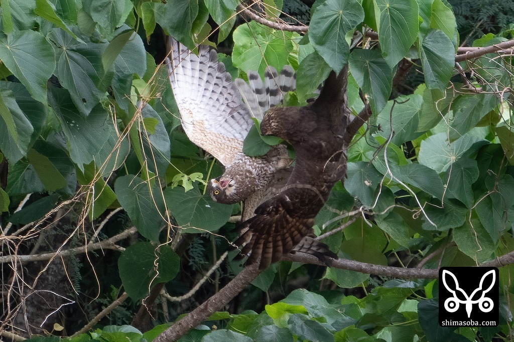 雄叫びを上げる幼鳥(手前)。この後、2羽がからまったまま落下して、成鳥が遁走しました。