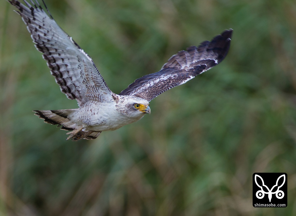 数十メートル先のカニを見つけて襲いかかるカンムリワシ幼鳥にアタックするツバメ。