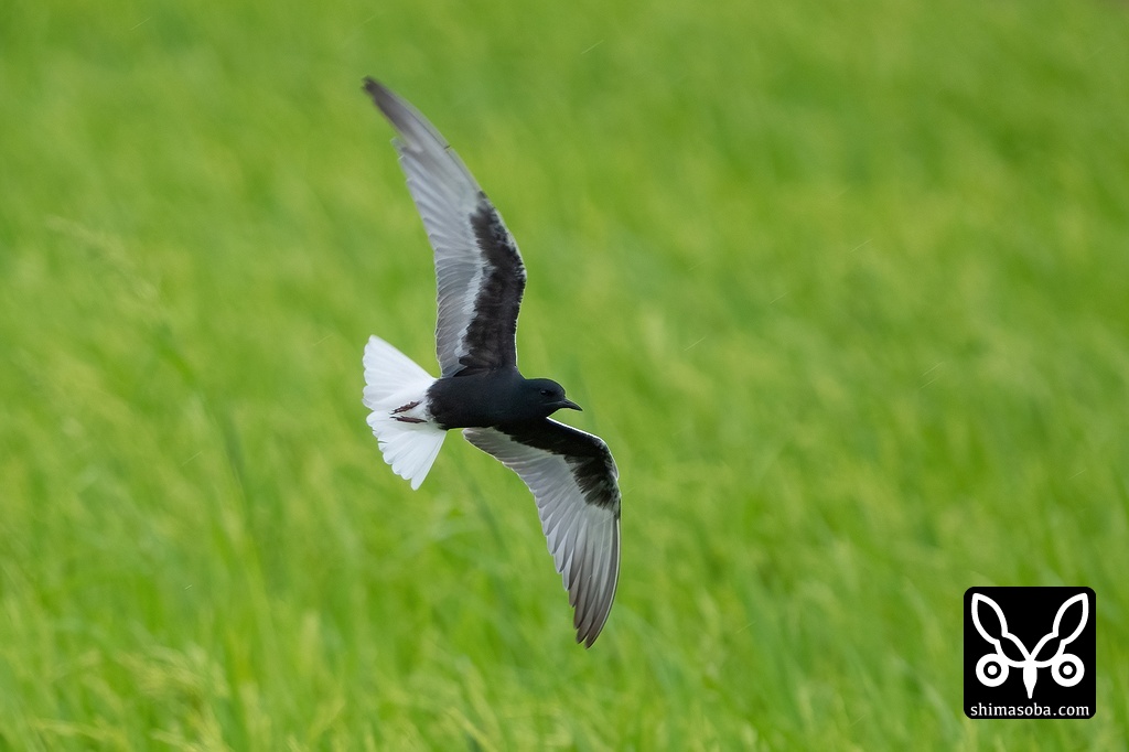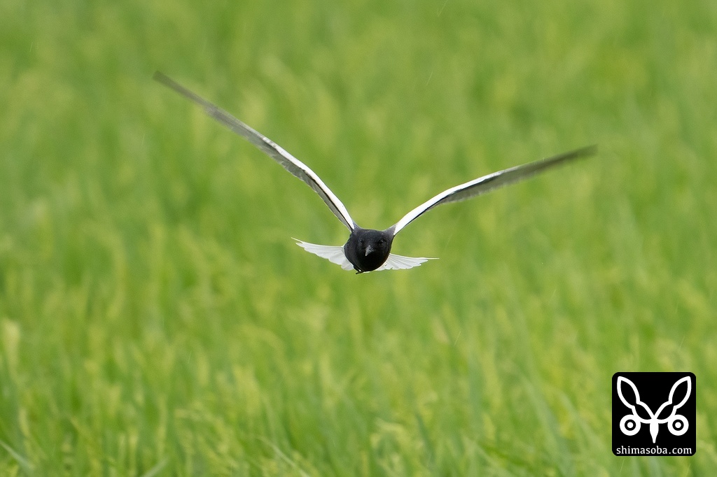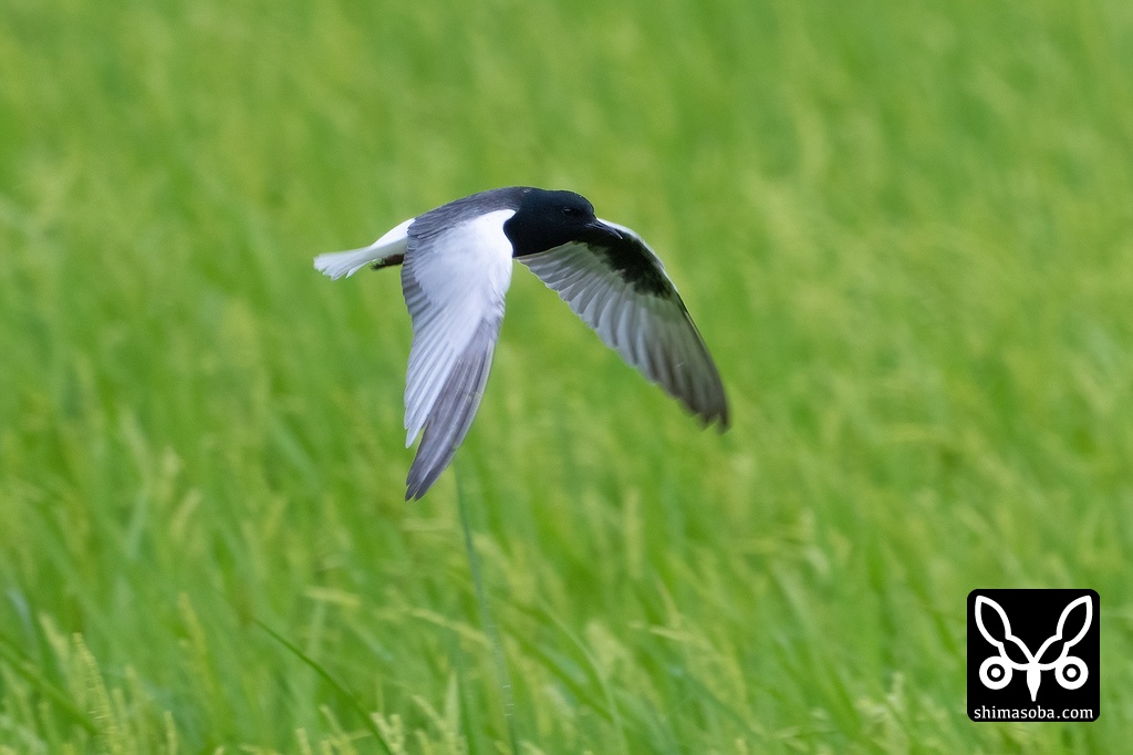 クロハラアジサシが複数入り、その中にハジロクロハラアジサシの夏羽が1羽いました。田んぼの上をひらひらと飛びながら虫をとっていました。