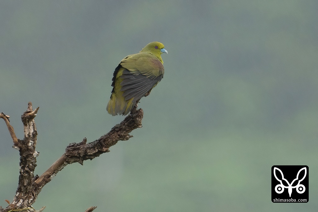 枯れ木に止まるチュウダイズアカアオバト。雨が降ると枯れ木や電線に多く現れます。