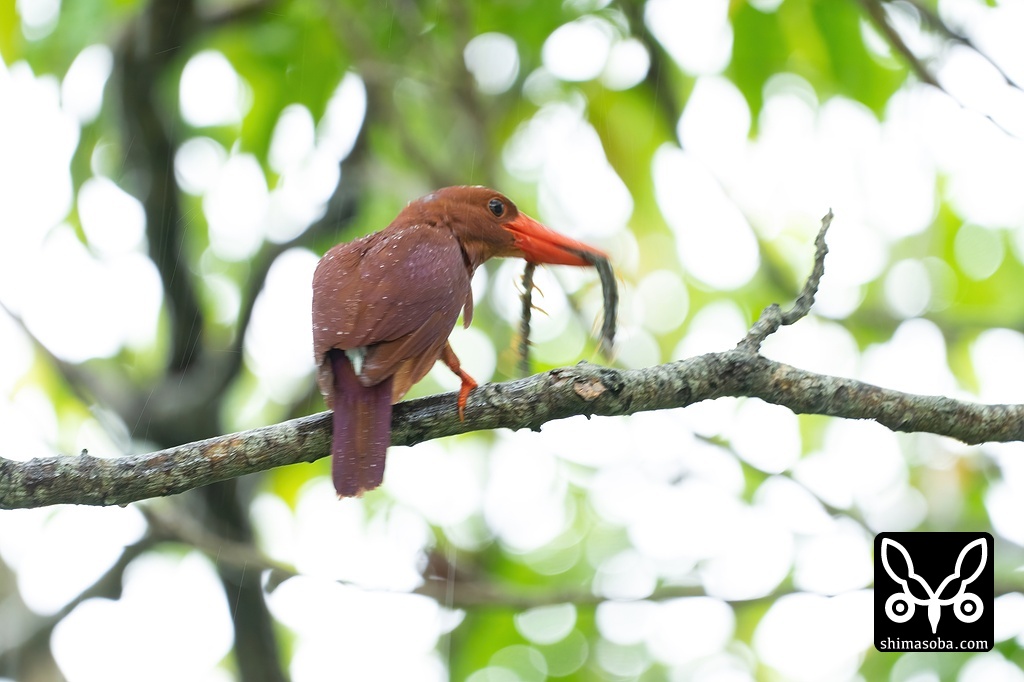 ヒナに与えるため大きなムカデを捕まえてきたアカショウビン。ヒナたちの成長は順調なようです。