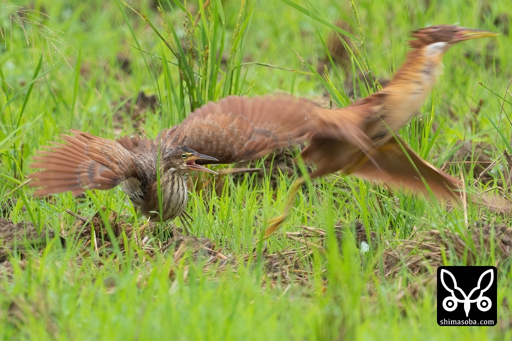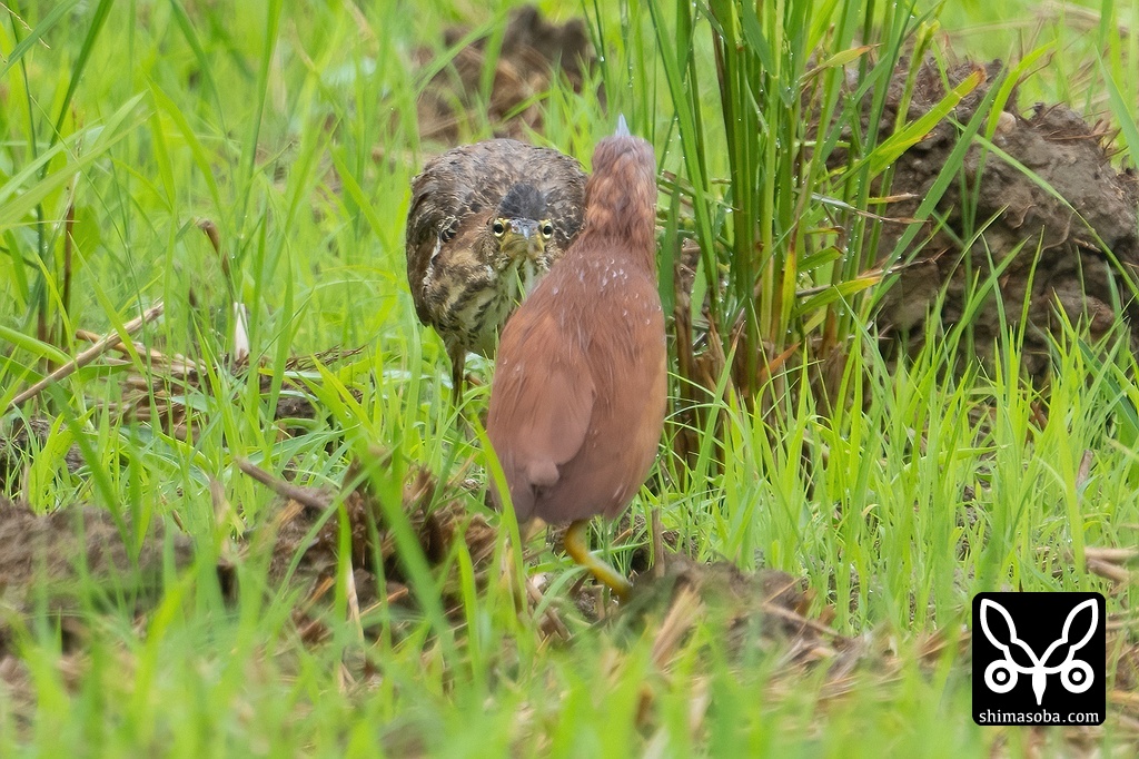 オス親(手前)に攻撃を仕掛けようかというリュウキュウヨシゴイのオス幼鳥。