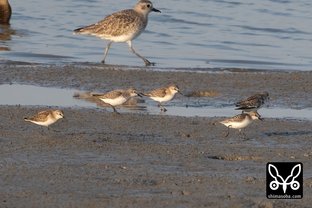 ハマシギに挟まれるヒメハマシギ。大きさは全く違うのでハマシギと間違えることはないでしょう。