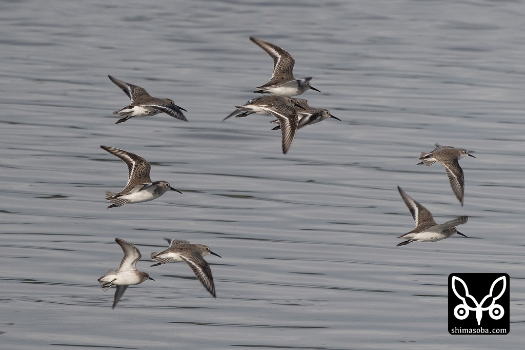ヒメハマシギとハマシギ。小さなヒメハマシギが先頭を飛んでいます。