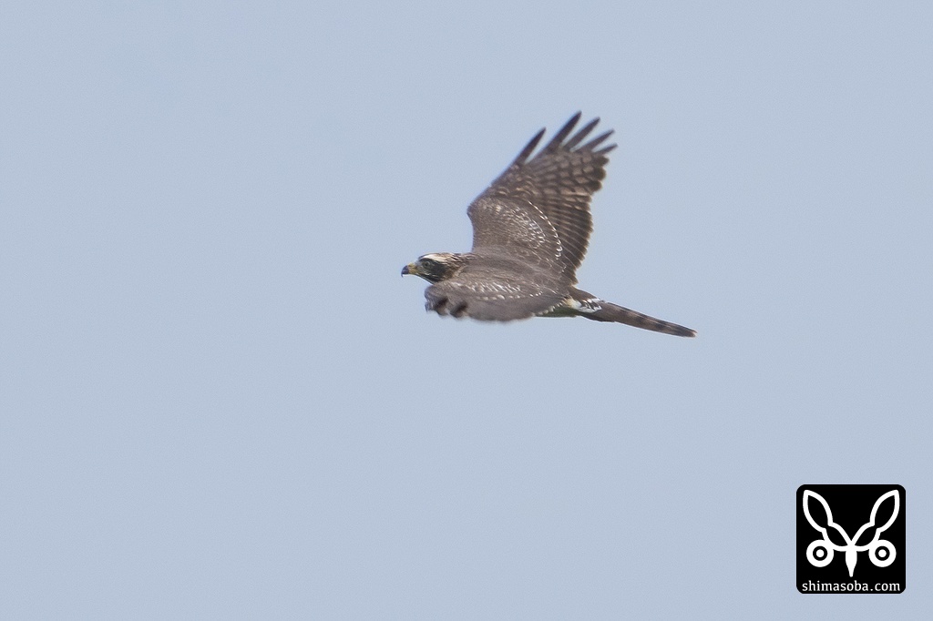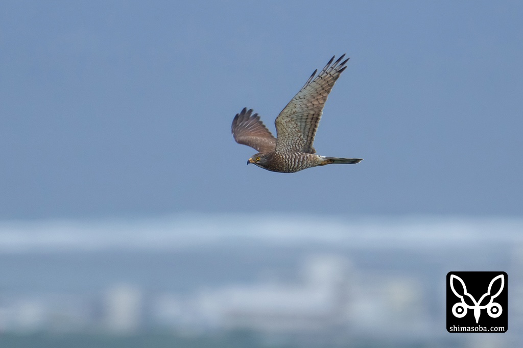 市街地上空を飛ぶサシバのメス成鳥。