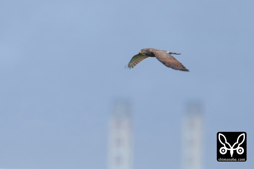 沖縄電力の煙突をバックに飛ぶサシバ。
