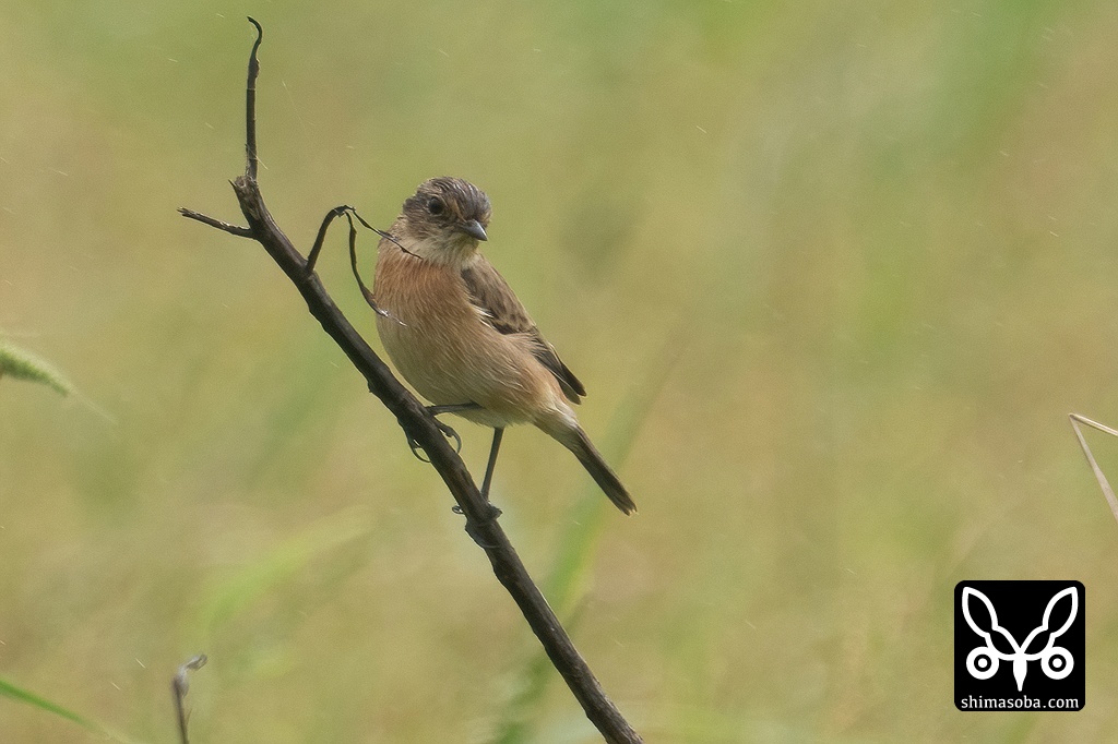 今季初のノビタキを水田地帯で確認。強い風の中、枝から枝へと飛び移りながら餌をとっているようでした。