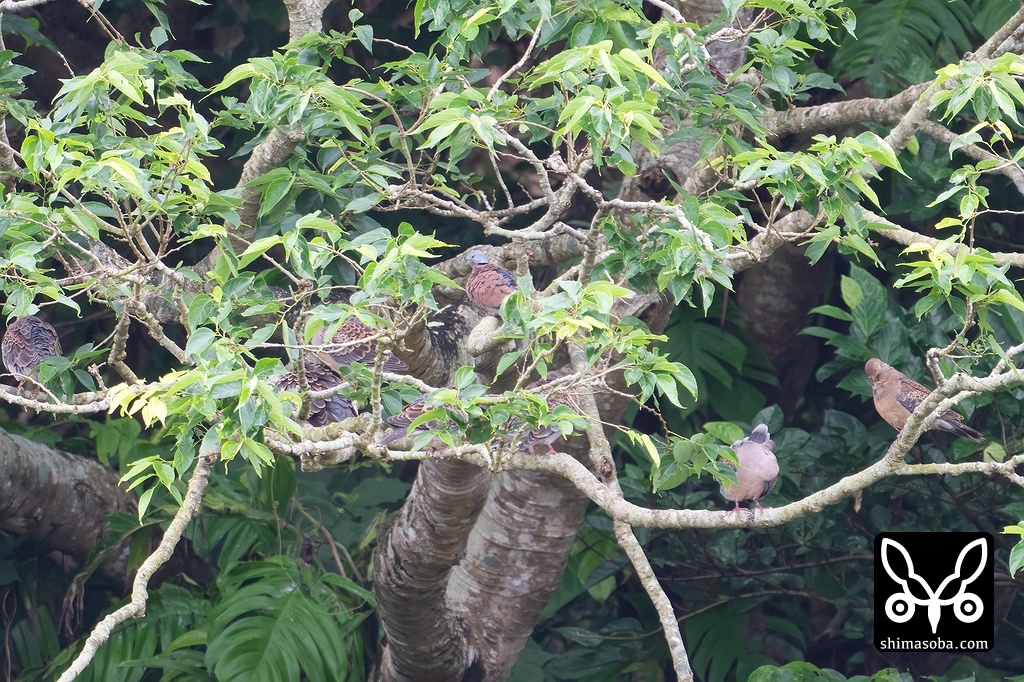 収穫の終わった田んぼには、落穂を拾おうと多くのキジバトが集まってきますが、石垣島の場合、その中には必ずと言っていいほど、ベニバトがいます。