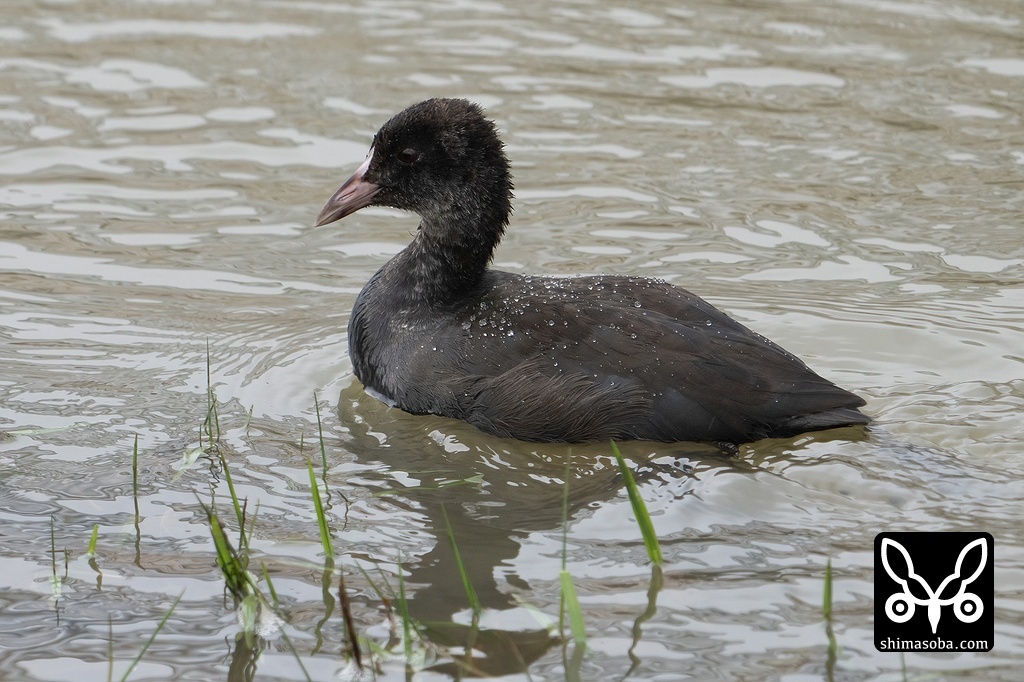 オオバン幼鳥。少し、首回りに白い羽毛があります。部分白化?